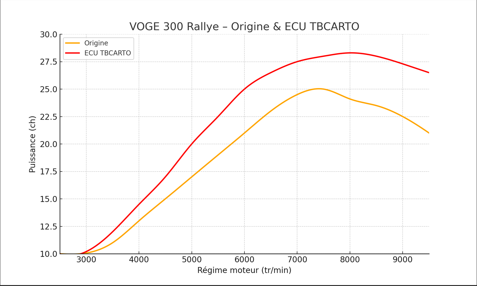 J’ai fait faire une reprogrammation pour la voge rally 300. Le changement est vraiment intéressant, beaucoup lus de couple et de souplesse, l’agrément est nettement meilleur, surtout ici ou les routes ardéchoises sont tout en virages avec gros dénivelé. Les détonations perçues à 2500 tr ont diminuées et le moteur chauffe moins. Le ralenti est aussi ultra stable. Trés bonne écoute et professionnalisme de TB Carto. Je recommande vivement.
